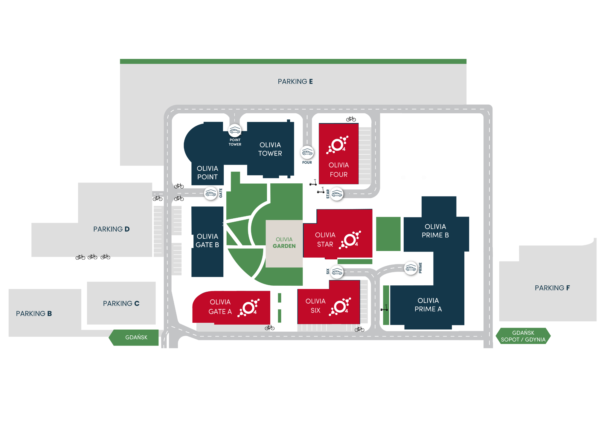 Dodatkowo możesz skorzystać z podziemnych i naziemnych parkingów oraz miejsca na rowery i hulajnogi.